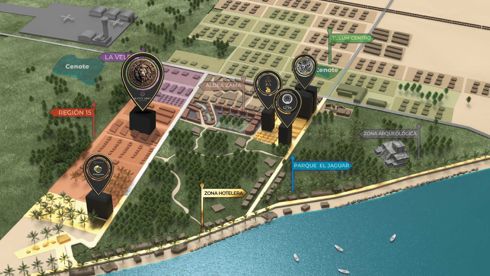 Menesse Santuario se divide en cuatro fases: Agua, Tierra, Aire y Fuego. Cada una de ellas, están inspiradas en los cuatro elementos naturales, fusionando lujo, sustentabilidad y conexión con la naturaleza.